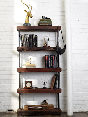 Ikea Billy bookcases are not going to do for this project. I am definitely drawn to the industrial metal style of the above - the open backs and sides, the rusted patina finish. Plus, I have a lot of books (even after recent purgings) and tend to buy more (we live within five minutes of a Half-Priced Books - my own personal crackhouse), and that means a lot of weight. So I went on the hunt for industrial shelves that I like and quickly found out that buying them at a store is probably not happening. Here's the inspirations and the DIY versions. I still haven't settled on any of them yet.